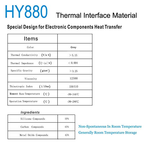 Details: HY880 grey super carbon-nano thermal grease, our best product which combine with CNT tech and organosilicone. Strength 16 times compared with stainless steel and thermal conductivity 5 times compared with copper. It’s excellent additive for new composite material. As thermal grease. It’s the best choice for your CPU/GPU Coolers and high power LED more than 150W. HY880 thermal grease through SGS and CE certification, in line with the EU RoHS, SVHC and REACH testing standards. Applications: High thermal demand module, Cooling device to the end plate or between the frame, High speed and large storage drive, Automotive engine control, Hard disk drive and DVD drive, Power conversion apparatus, High power LED, Laptop and Desktop computer, Network communications equipment, Household appliances, Electronic components. Features: 1. Nano thermal grease, thermal conductivity 5.15W/m-k 2. Good electric insulating, breakdown 10kv voltage 3. Low thermal impedance, keep grease condition with long time 4. With a wide range working temperature, keep stable performance at -30~280 Celsius degree 5. High performance, saving your cost How to use 1.Clean the CPU and heat sink surfaces,Wipe the surface lightly with a cotton ball or cotton swab dampened with alcohol or our thermal cleanser 2.Place a tiny drop of thermal grease to the center of the cooler base,smear it evenly with scraper or finger cot,best thickness is 0.13~0.15mm 3.Attach the heat sink to the processor and Avoid removing the heat sink after installing it.