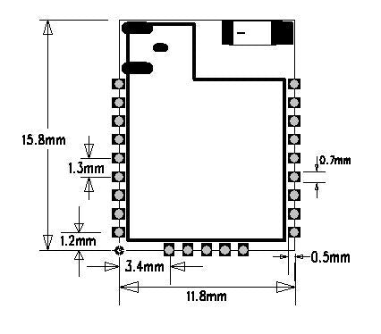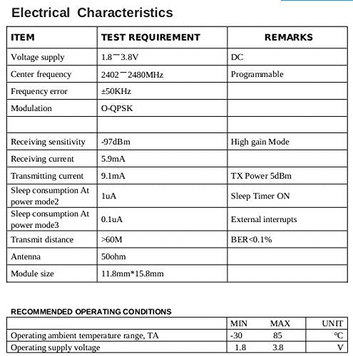- Size: 11.8mm x 15.8mm; Operating Voltage: 1.8V to 3.8V; Operating Temperature: -40 to +85C; 8.4 mA Transmit Mode (+5 dBm); 7.4 mA;