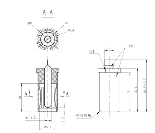 - Overall Length: 18.5mm; Outer Diameter:7.0mm; Inner Diameter:5.5mm; Pin Diameter:2.1mm; Max Panel Depth: 3mm