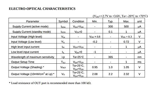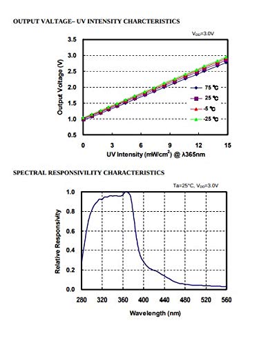 Details: The GY-ML8511 with breakout is an easy to use ultraviolet light sensor. The MP8511 UV (ultraviolet) Sensor works by outputing an analog signal in relation to the amount of UV light that's detected. This breakout can be very handy in creating devices that warn the user of sunburn or detect the UV index as it relates to weather conditions. This sensor detects 280-390nm light most effectively. This is categorized as part of the UVB (burning rays) spectrum and most of the UVA (tanning rays) spectrum. In the power down mode, typical standby current is 0.1microA, thus enabling a longer battery life. APPLICATIONS: Smart phone, Watch, Weather station,Bicycle navigation, Accessary, Gaming