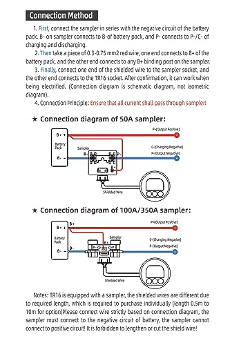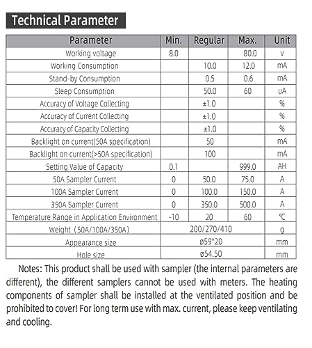 Details: Using steps: 1. Connect and check the current: Power on after complete the connection as shown,the screen should display capacity percentage. If the screen has no response,please check the connection. Then charge or discharge the battery, and check whether the display current is equal to the actual current. If the deviation is large please check the connection. 2.Capacity reset: On first use, the percentage and capacity are not the actual value,you should reset the capacity:discharge the battery totally and hold the “V” key for 3 seconds to set the capacity zero or charge the battery fully and hold the “%”key for 3 seconds to set the capacity full. And it doesn't need to do this again later, except replace the battery. 3.Check and reset the actual capacity: If you find the display capacity don't match the actual capacity,please check and reset the actual capacity:discharge the battery totally and hold the “V” key for 3s to set the capacity zero,then set the capacity value as large as possible. Then charge the battery fully,and the display capacity is the actual capacity. Finally set the display capacity as preset capacity (Please refer to use and setting). Connection: We need a shielded wire and a ordinary wire (0.3-0.75 mm2).One end of the ordinary wire connects to positive of battery,another end connects to B+ of sampler (any one is ok).The B- of sampler connects to B- of battery. P- of sampler connect to P- of output. Finally connect sampler to coulometer by the shielded wire.(Notice: The diagram is not equal proportion) Installation: First,open a round holes of 54.5mm on the panel of the equipment. Then install the coulometer from the front of the panel. Finally,tighten the bracket on the back. As shown below: Attention: Please connect as shown strictly. The sampler must be connected to the negative circuit, it is forbidden to connect to the positive circuit.
